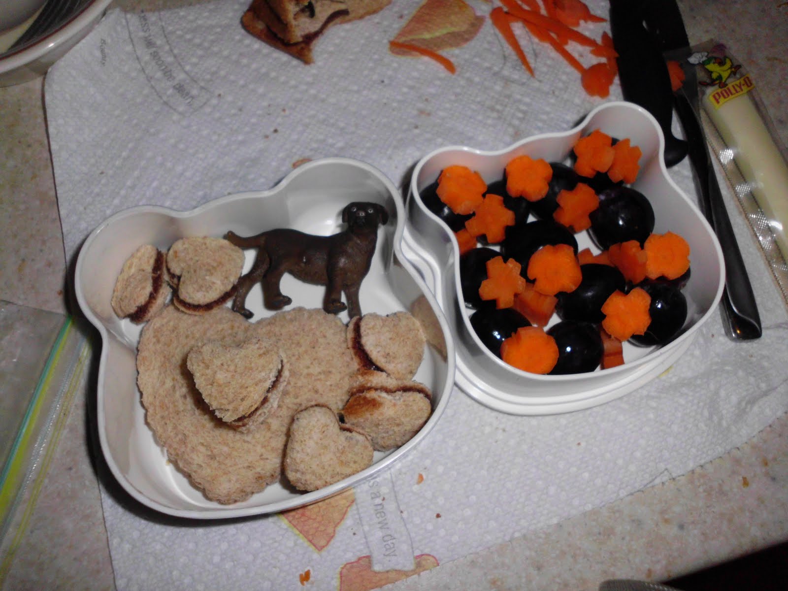 Nutella hearts on organic whole wheat bread, plastic "Tasha" dog friend, cheese stick, carrot flowers and black grapes.
