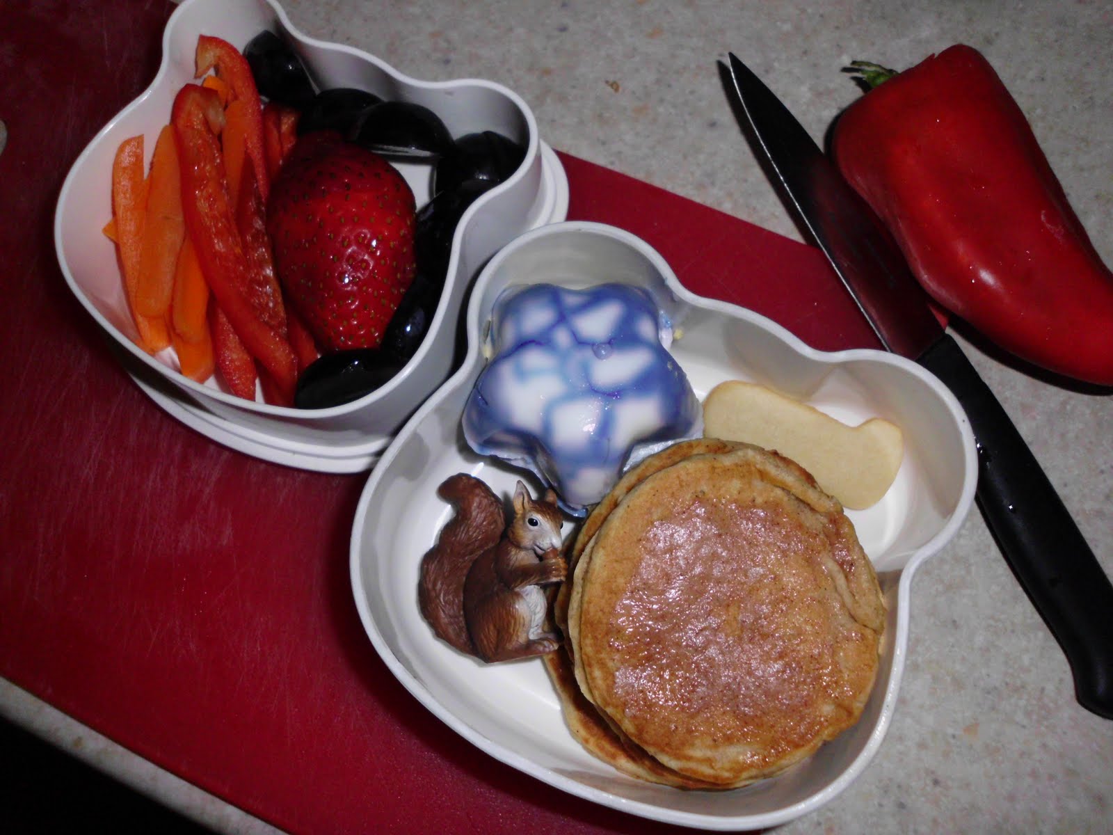 Lunch: Orange carrot and red bell pepper sticks, strawberries and dark purple grapes. Tie dye hard boiled egg (supposed to be a star but looks more like a flower to me). Apple cider whole wheat pancakes with cinnamon butter. A #1 sugar cookie and a squirrel to keep her company.