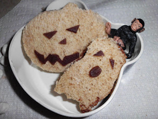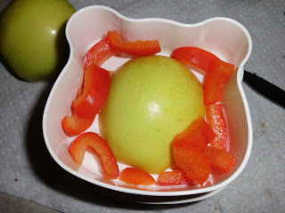 Lunch: Golden delicious apple, red pepper pieces in the top. Nutella on whole wheat sandwiches with fruit leather details. Monkey friend rode along. String cheese, not shown. Yogurt covered fruit snacks linger in the background. They went in after I fit everything together.