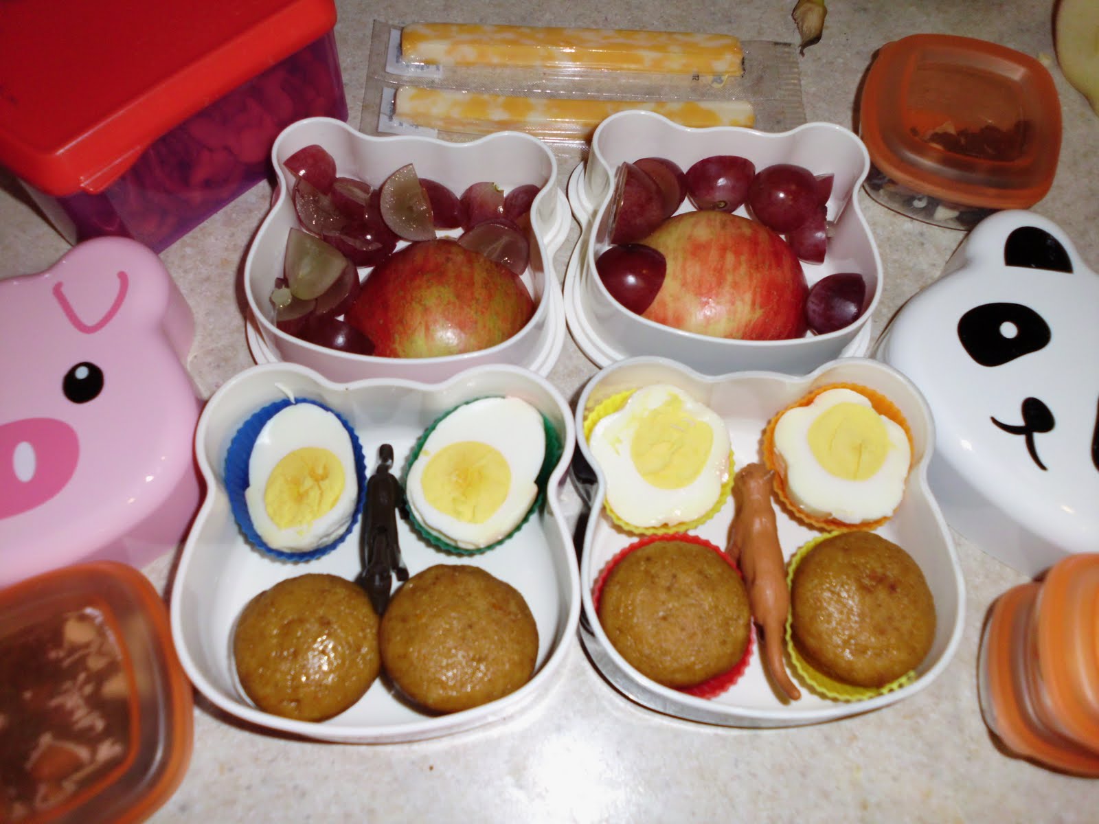 Lunch(es!): Half an apple for the big kids and cut up grapes. Hard boiled egg. Pumpkin muffins. The friends were a small puppy for the little lady and a cougar for the big girl.