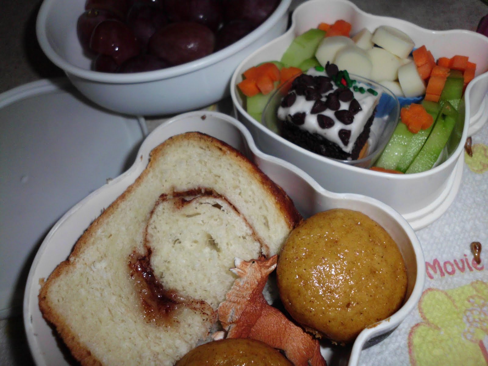 Lunch: Home made cinnamon swirl bread. Mini pumpkin muffins. Little doggy. Cucumber and carrots. Cheese. Chocolate cake just for fun. Grapes.