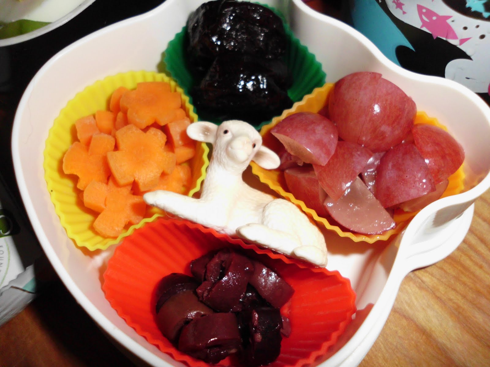 Lunch: Hard boiled egg with the tiniest sprinkling of sea salt (The magic trick to getting her to eat it!), cucumber slices and mini pumpkin muffins in the bottom with a chocolate kiss. The top contains carrot flowers, black olives, grapes with the seeds removed and cut up and two prunes. My kid LOVES black olives and prunes. She was very excited about this lunch. A little lamb is going to school this day!