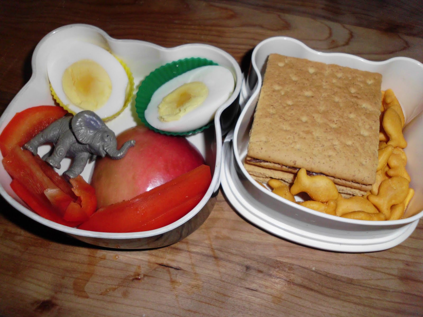 Lunch for the 5 year old: Hard boiled egg, half an apple, red pepper strips and an elephant in the bento bottom. Nutella on graham crackers and goldfish in the top.