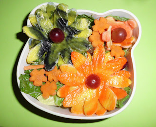 Lunch: Egg sheet in red/orange and blue/green with yellow (natural color) tie dye pattern cut into flowers. Carrot flowers, grape centers and a bed of lettuce, with red cabbage and carrot slivers.