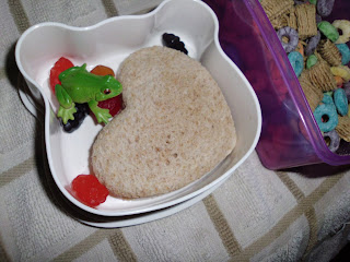 Lunch: Cream cheese on whole wheat heart, fruit snack pieces. Not shown: hard boiled egg, carrots and grapes (forgot the pic!)