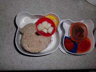 Day Two: Two Nutella and whole wheat ducky sandwiches, two small cups of cheese cubes, red bell pepper hearts and peanut free trail mix. Not pictured is a small cup of cinnamon applesauce and the little Hello Kitty friend.