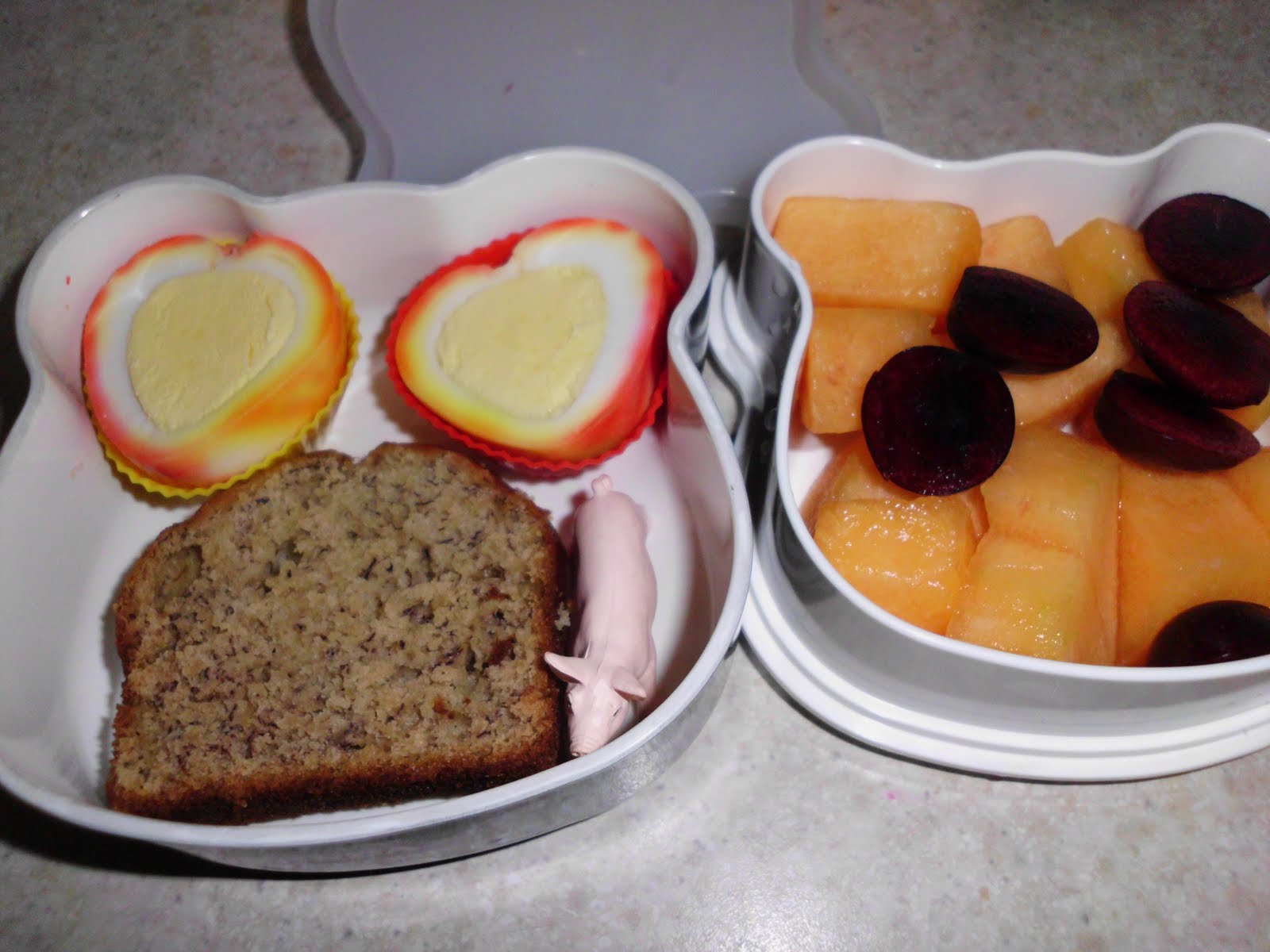 Day 10: Tie dyed hard boiled egg heart, banana bread, cantaloupe and cherries. Very small pig. Not shown is a container of cheddar popcorn.