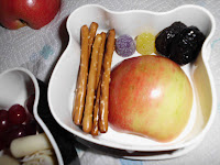 Lunch: Provolone and turkey roll ups, red grapes, pretzels, apple, two prunes and two spice drop candies.