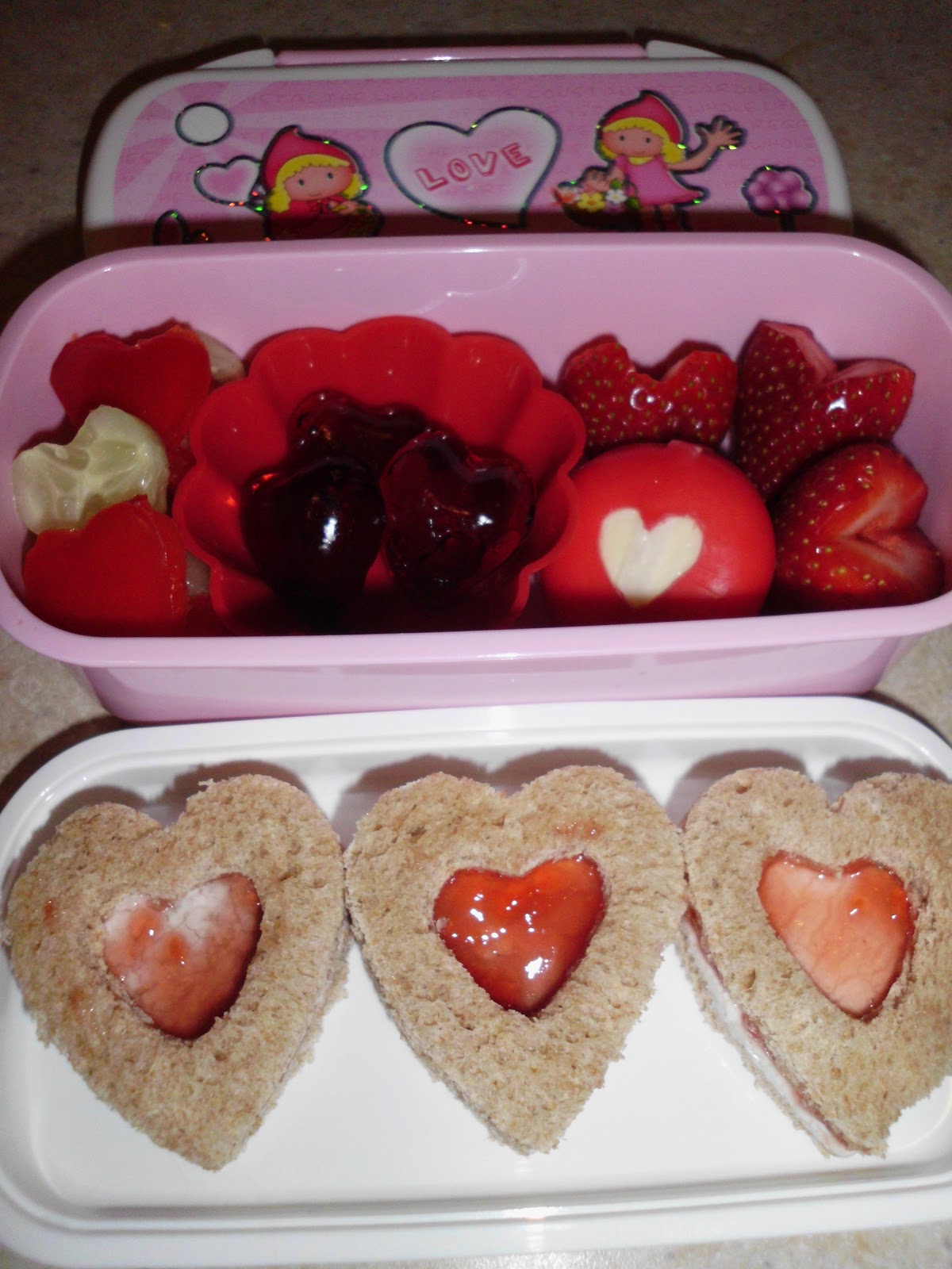 Lunch: Whole wheat hearts with cream cheese and strawberry jam in the top. Red bell pepper and cucumber hearts, jello jigglers hearts (blackberry fusion flavored), mini babybel cheese and strawberry hearts in the bottom.