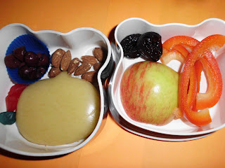 Lunch: White cheddar melted onto whole wheat, cut into a pumpkin shape. Black olives, almonds and fruit snack pieces. Top has two prunes, half an apple and red pepper strips.