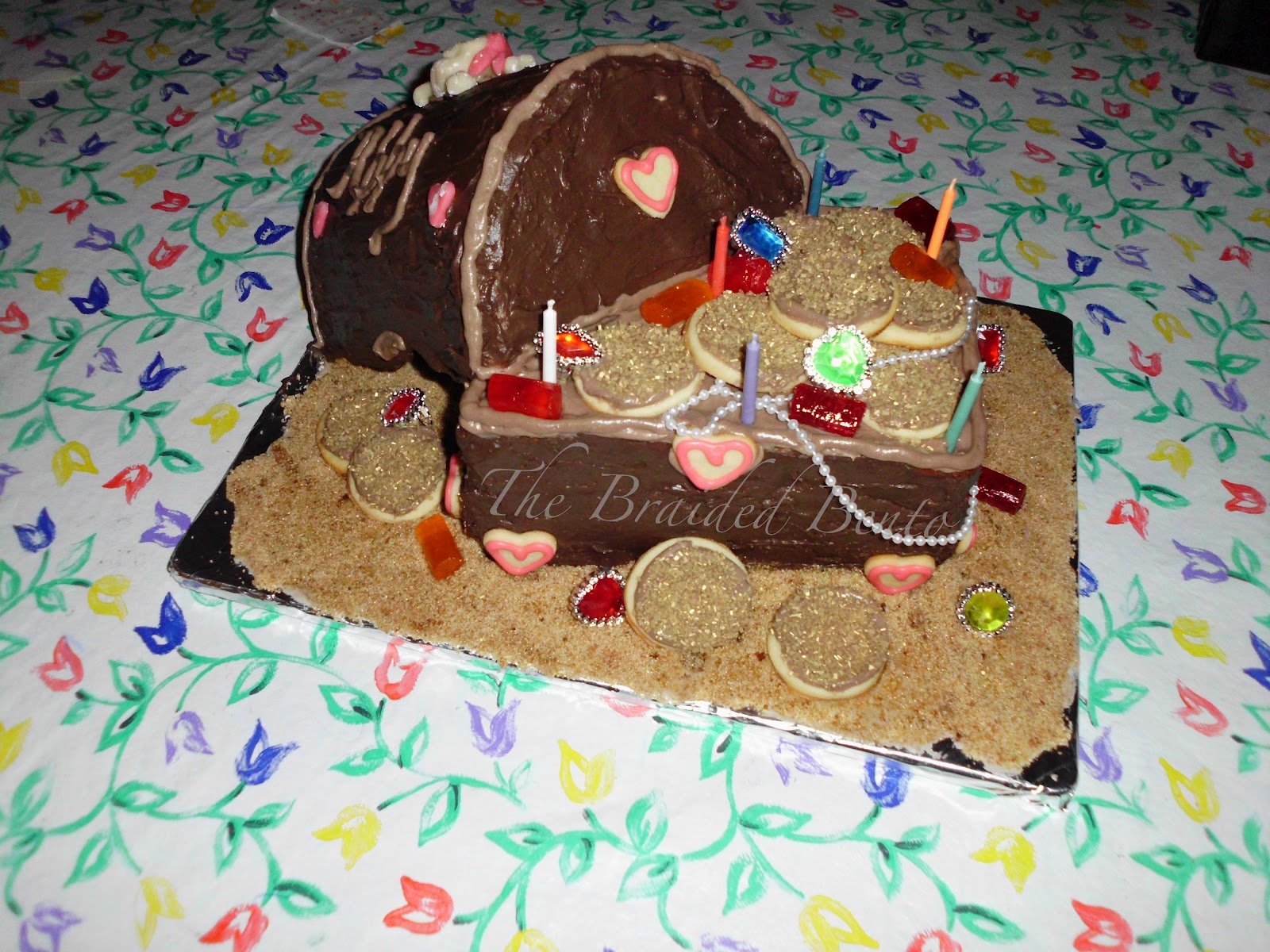 This is a two layer almond pound cake with two toned chocolate frosting. The top is made from sugar cookie dough baked over a 1 gallon jar and two half circles, frosted together in gingerbread house style. The sand is brown sugar over vanilla frosting, the coins are cookies with gold sprinkles. The jewels are jolly ranchers. The rings and pearls are plastic.