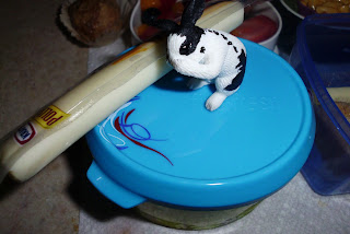 Little Lady's snack: Fruit salad, cheese stick and a mini muffin.