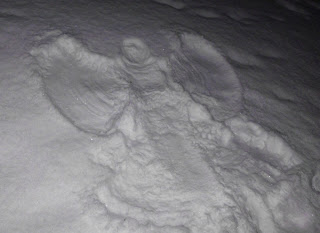 This pumpkin muffin man was made by spreading about 3/4" of pumpkin bread batter in the bottom of a large, foil lined loaf pan. After baking, I used a cookie cutter to cut out the men. I made a teeny tiny batch of vanilla cream cheese frosting (a few spoonfuls total) and made the apron, hat and secured the detail with it. He has a Craisin mouth (ok half a craisin), chocolate chip bits for eyes and white and semi sweet chocolate chips "glued" on, just for fun. He's making a snow angel on a bed of cheddar popcorn.