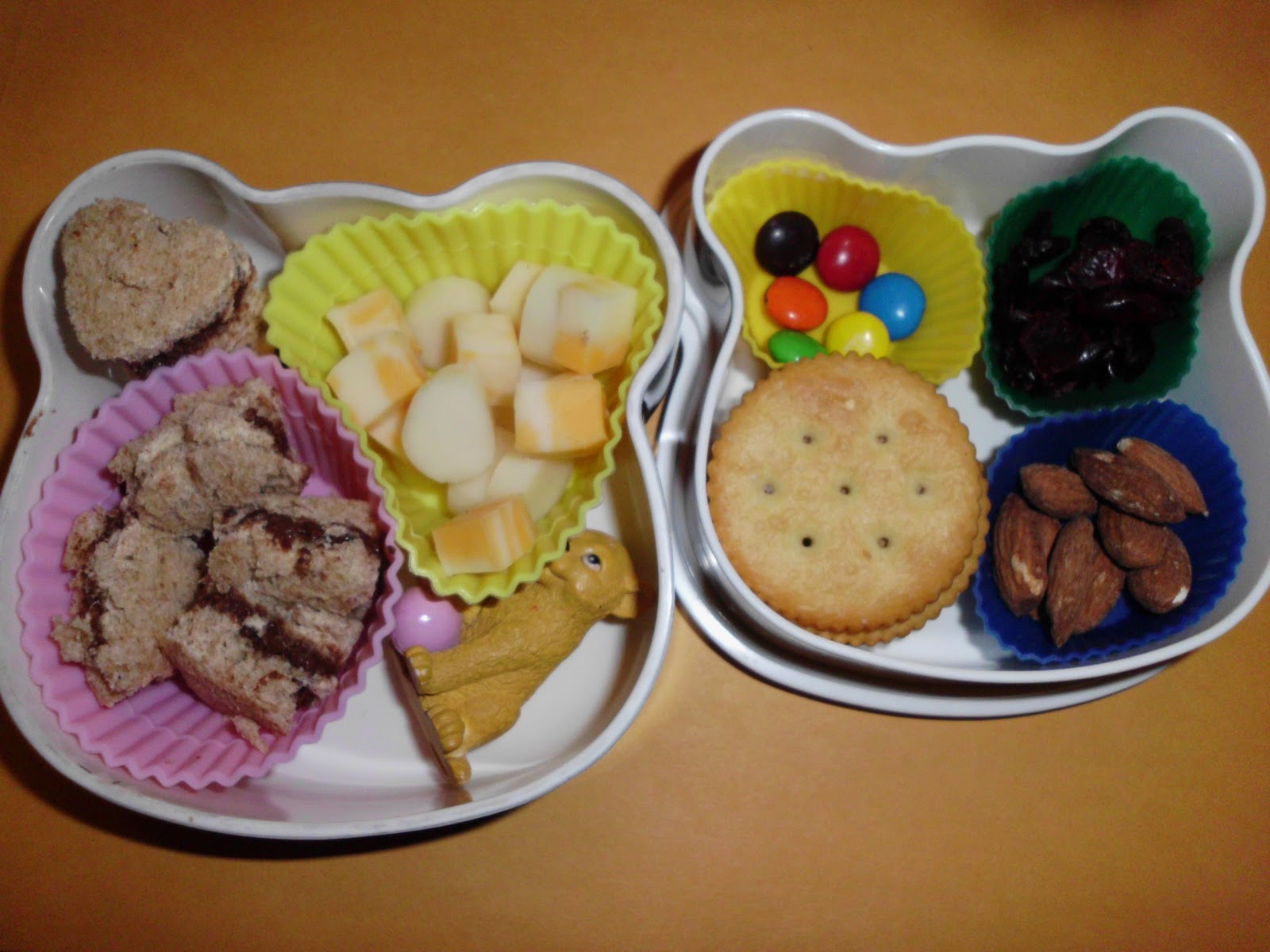 Lunch: Nutella on whole wheat hearts and cheese cubes with a beloved little lion friend in the bottom. Cracker nutella sandwiches, roasted almonds, craisins and a few m&m's in the top.